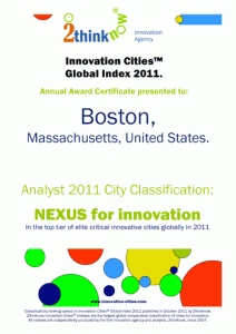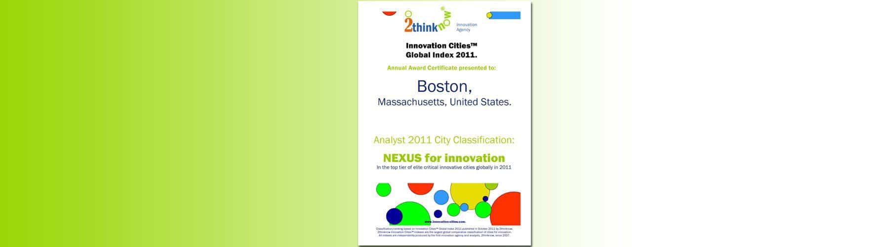 2thinknow, publisher of the Innovation Cities™ Indexes each year issues award certificates to the world’s innovation cities. These are available to service package subscriber clients and for order online. The Award certificates display: