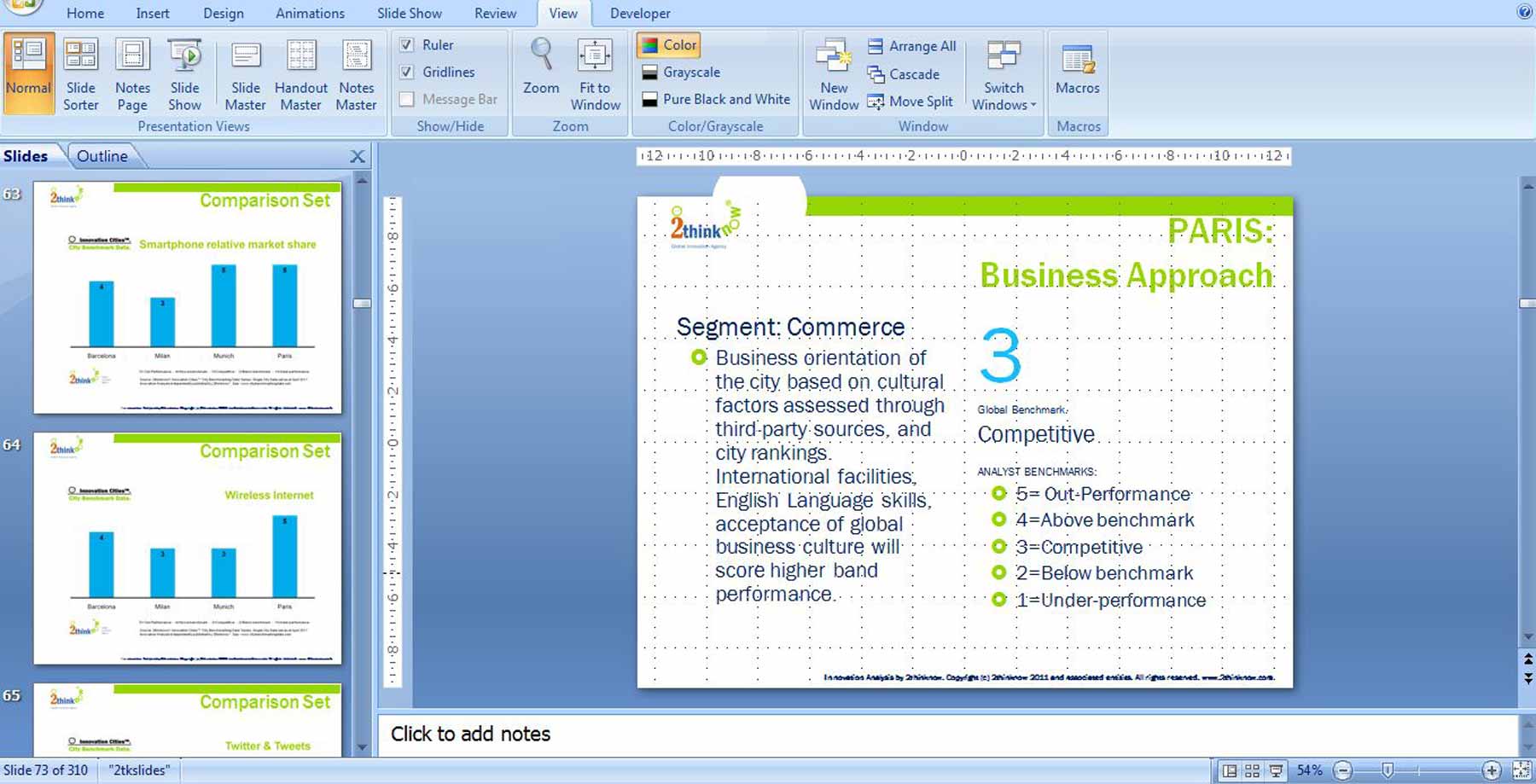 Ranking and scoring cities by their innovation economy potential, the Innovation Cities™ Global Index 2010. The comprehensive ranking of cities comparative performance in the innovation economy since 2007. Publisher 2thinknow. This covers 31 sectors of the economy and community. The top 100 cities are ranked, others are awarded performance categories.